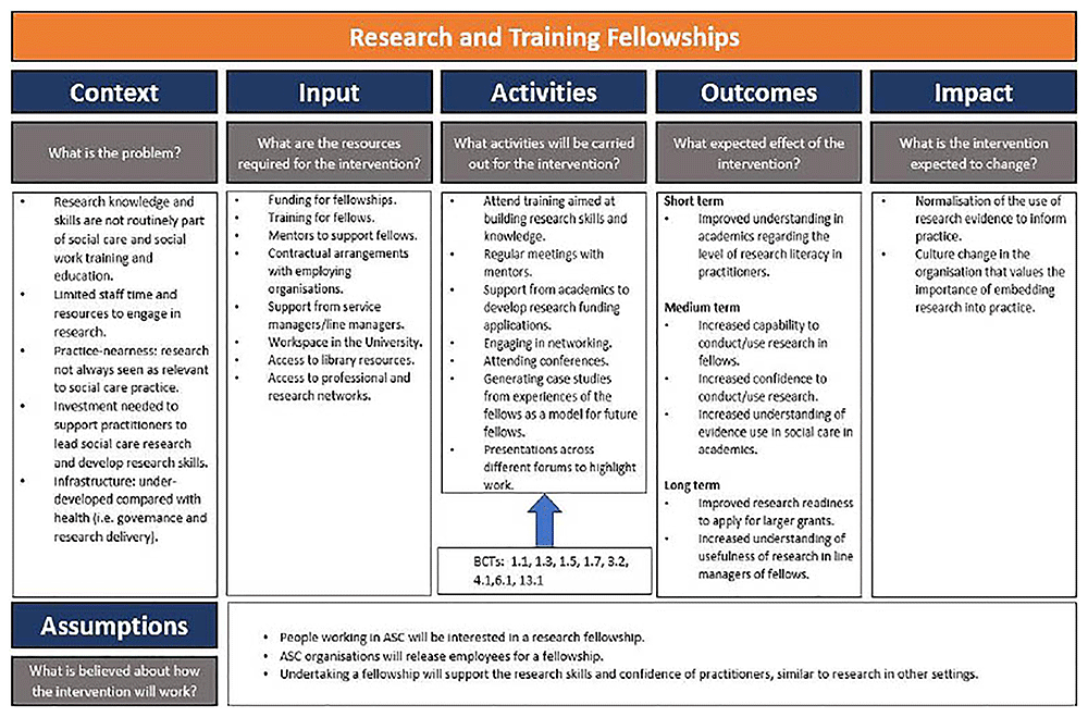 Finally, opportunities to conduct, discuss and engage with research will be increased. For example, the CoP will create a sense of shared interests and ideas and promote research as the ‘social norm’. The Fellows will act as pioneering models for how research can be embedded into ASC and demonstrate ‘the art of the possible’ for how a workforce already struggling with capacity can meaningfully engage with research. To improve the provision of opportunities, three BCTs will be used to support and facilitate the building of research capacity (i.e., social support (practical and emotional), demonstration of behaviour).