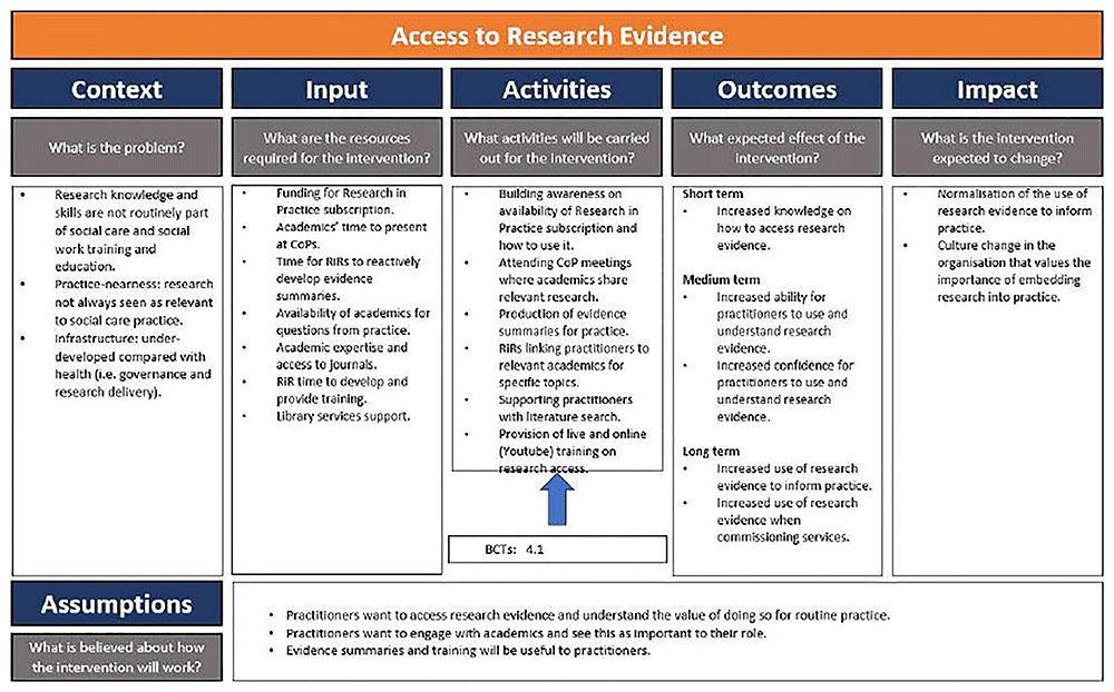 In relation to developing the ToC, the COM-B acted as a framework to identify literature on the key barriers that prevent those working in the ASC sector from engaging and using research. This information subsequently provided a basis from which to choose appropriate Behaviour Change Techniques (BCTs). Behaviour Change Techniques are specific strategies or methods that can be used to facilitate changes in the target behaviour. The BCT Taxonomy (version 1) describes 93 BCTs that can be incorporated into an intervention to address the problems and challenges identified under each COM-B component (Michie et al., 2013).