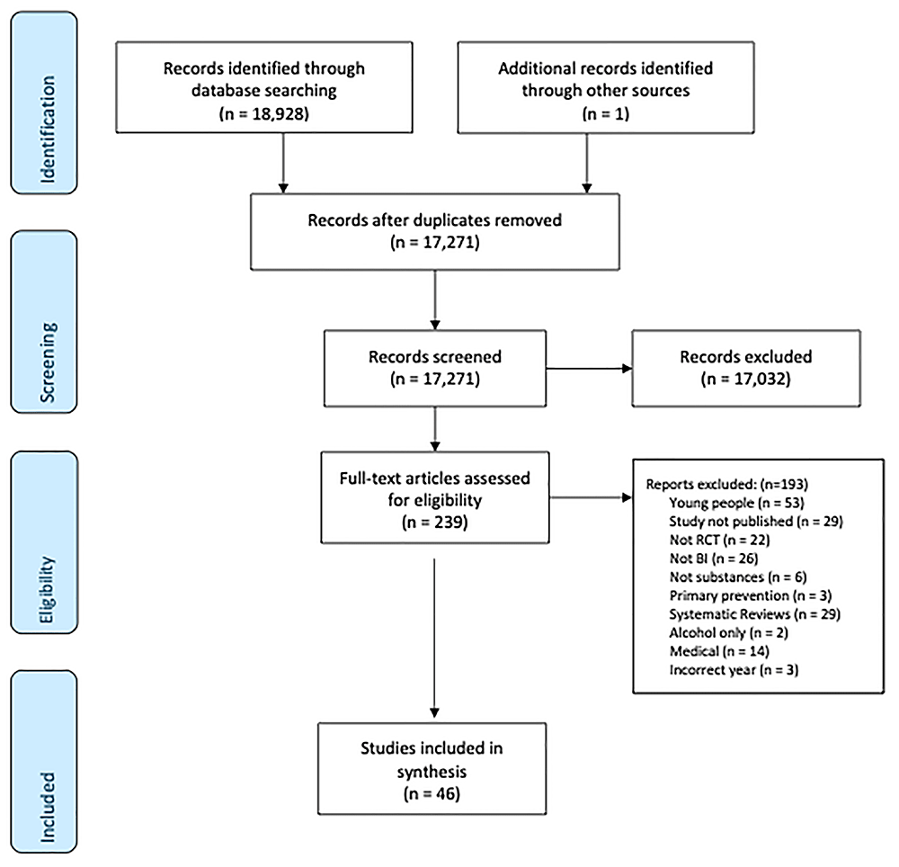 Papers were included if they used quantitative research methods, specifically RCTs, to explore the properties of brief interventions for adults aged over 18 years old for substance use.