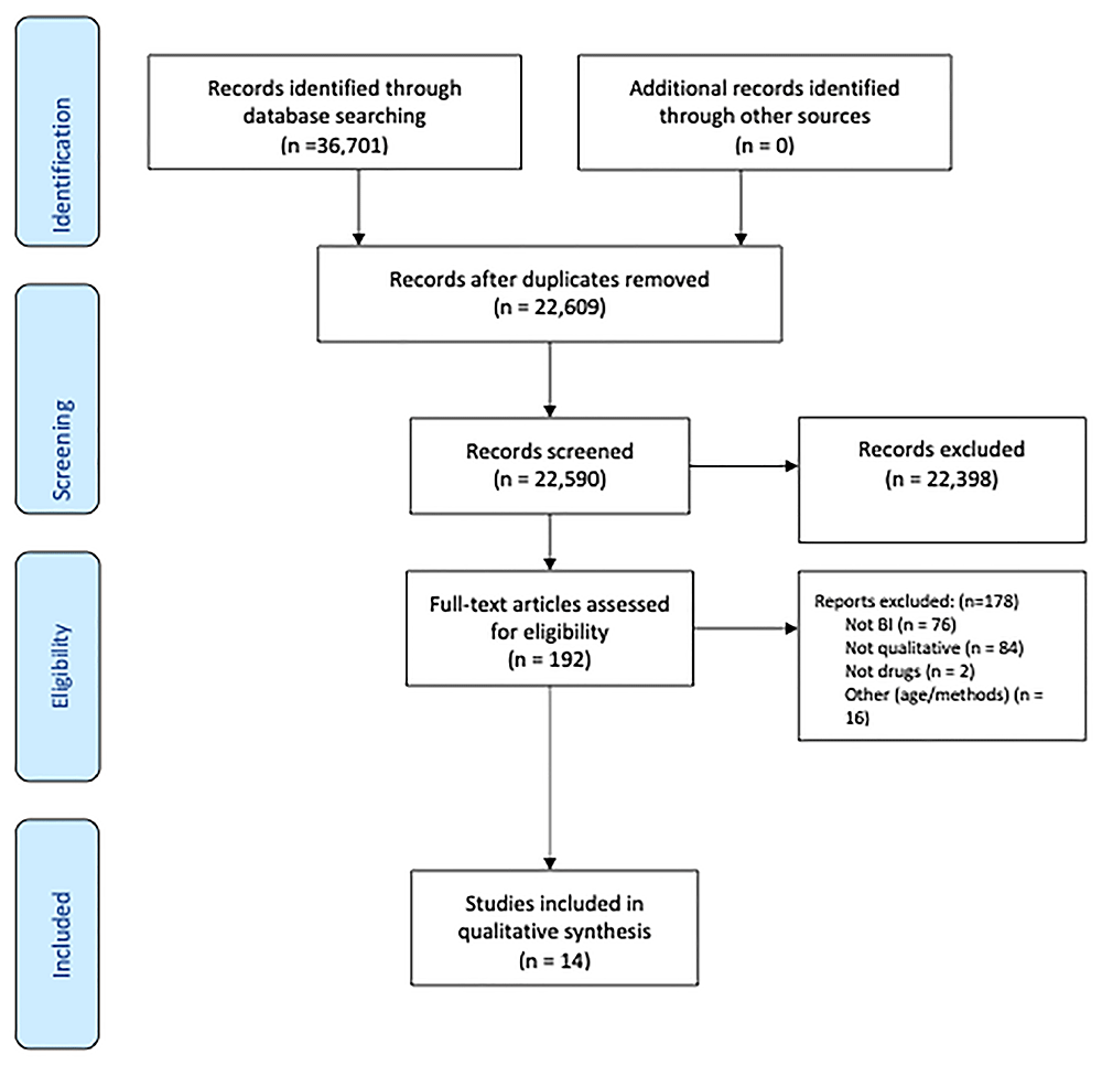 The initial searches yielded 22,609 records. In total, 14 met the inclusion criteria and were included in the review (Aharonovich et al., 2012; Darker et al., 2016; Dujon, 2021; Fazio et al., 2022; Hunter et al., 2018; Morris et al., 2024; Owens et al., 2018; Roberts & Nuru-Jeter, 2010; Rudzinski et al., 2012; Saunders et al., 2019; Sharma et al., 2023; Starks et al., 2020; Venner et al., 2018; Whiteside et al., 2010) (Figure 2). The articles were published between 2019–2023. Eleven were from the USA and one each from Canada, Ireland and India.