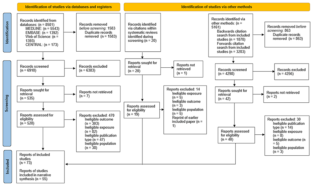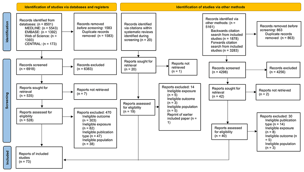 The database searches identified 8501 records, and 5181 records were identified using other methods. After examination of potentially relevant full text articles, 73 articles25–97 met the criteria for inclusion in the review (Figure 1). For a comprehensive summary of the characteristics of these 73 articles, see Table S1 in the extended data21.