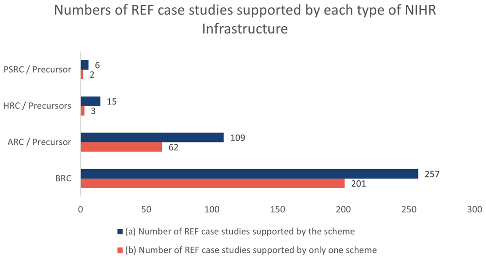 This graph shows (a) how many REF impact case studies have been supported by each type of NIHR infrastructure and (b) how many REF impact case studies have been supported by just one infrastructure scheme.