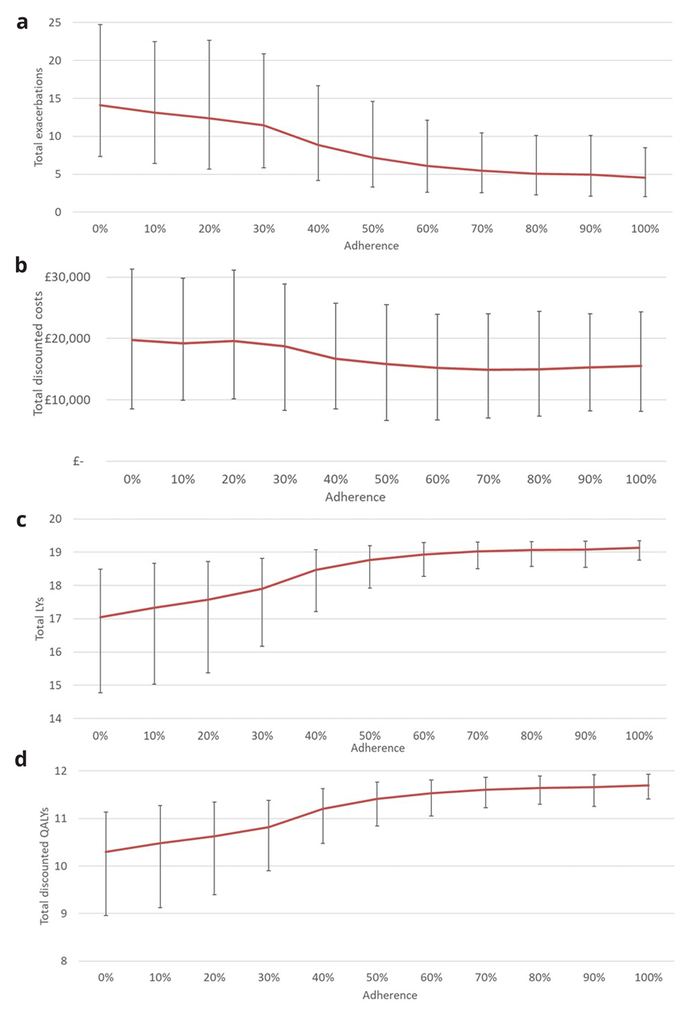 The Figures 3a–d also provide the ability to directly compare the estimated impact of increasing levels of adherence, for example as the result of a new intervention. For instance, an educational intervention that increased an individual’s medication adherence from 50% to 70% would be expected to reduce their number of exacerbations by 1.75 over 20 years, while increasing their expected life years by 0.26 years, discounted QALYs by 0.20, while reducing the discounted costs of providing their healthcare by £989.