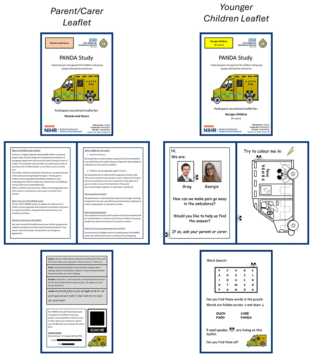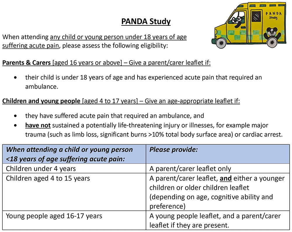 A recruitment leaflet labelled “Older Children” was developed to target children aged approximately 10–15 years. The leaflet contains pictures, a word search, and more information about the PANDA Study. The text within this leaflet was developed to a Flesch Reading Ease score of 80 or more (“easy to read”) to maximise readability. Whilst the “Younger Children” leaflet is aimed at those aged 4–9 years, and the “Older Children” leaflet is aimed at those aged 10–15 years, the ambulance clinician or emergency department staff member may use their discretion, along with child/parent/carer choice, to provide the most appropriate leaflet.