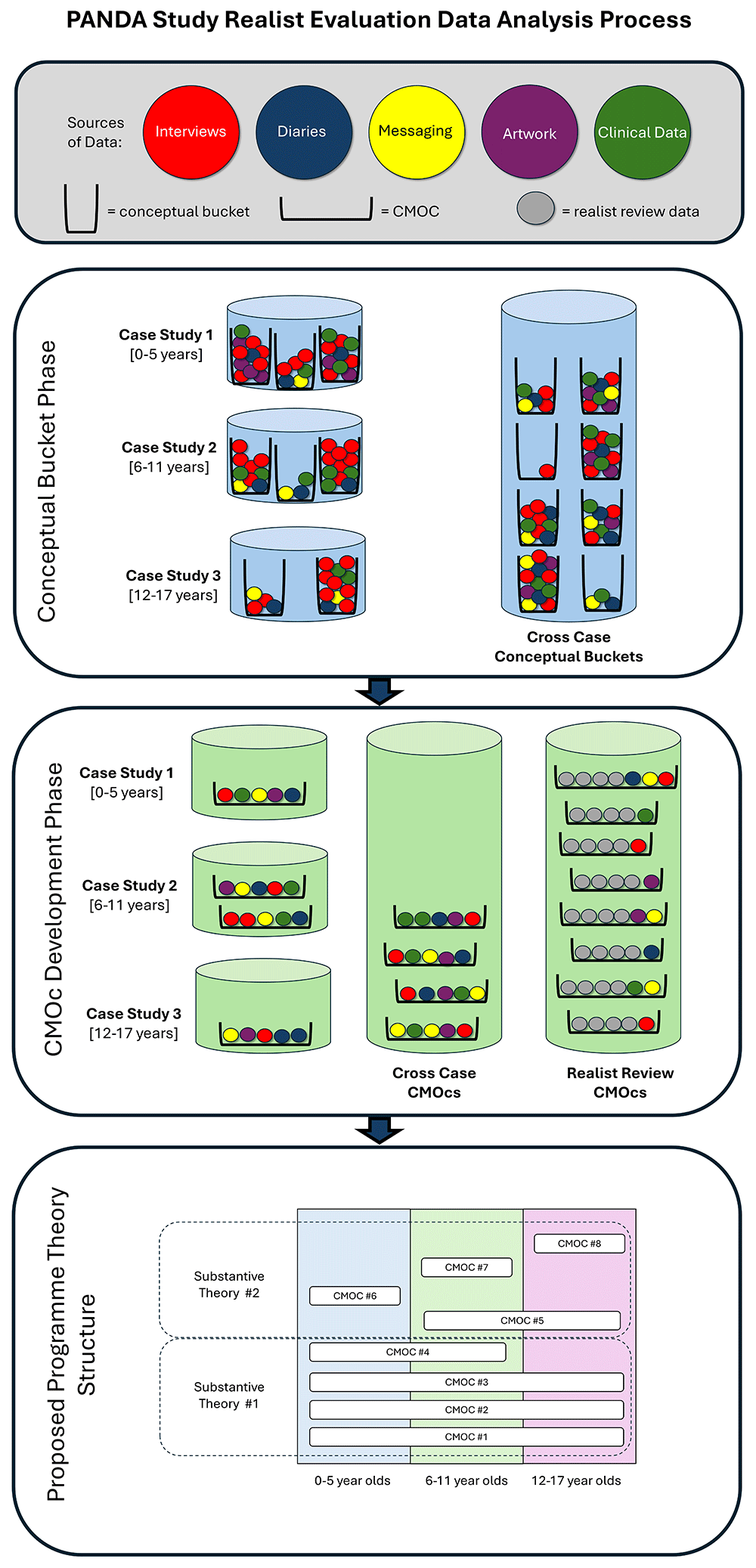 After coding is complete, for each conceptual bucket, we will determine what may be functioning as contexts, what may be functioning as outcomes, and what may be functioning as mechanisms. Through an iterative process, new CMOCs will be developed. Where data further substantiates previously developed CMOCs from the realist review, these data will be coded to the existing CMOCs. Where data contradicts previously identified CMOCs from the realist review, these will be coded, and the CMOCs revised or removed after discussion with the PANDA Study working group and other stakeholder groups.