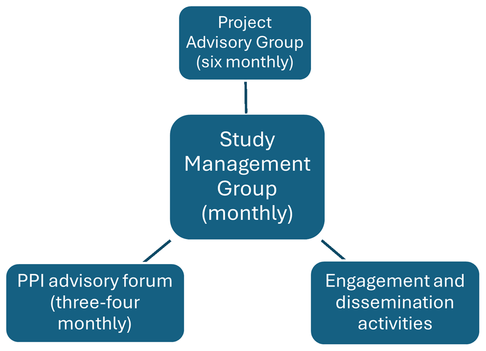 In the study design, PPI activities were described in four broad components: The study management group and the project advisory group followed the standard operating procedures for studies funded by NIHR and conducted within the trials unit. The advisory forum and engagement activities were designed specifically for this study to ensure that PPI focussed work had protected time, resources and status in the study processes. These components were discussed and designed in the preparatory phase (see Figure 1) but refined through discussion of a Memorandum of Understanding in the first PPI forum (see below).