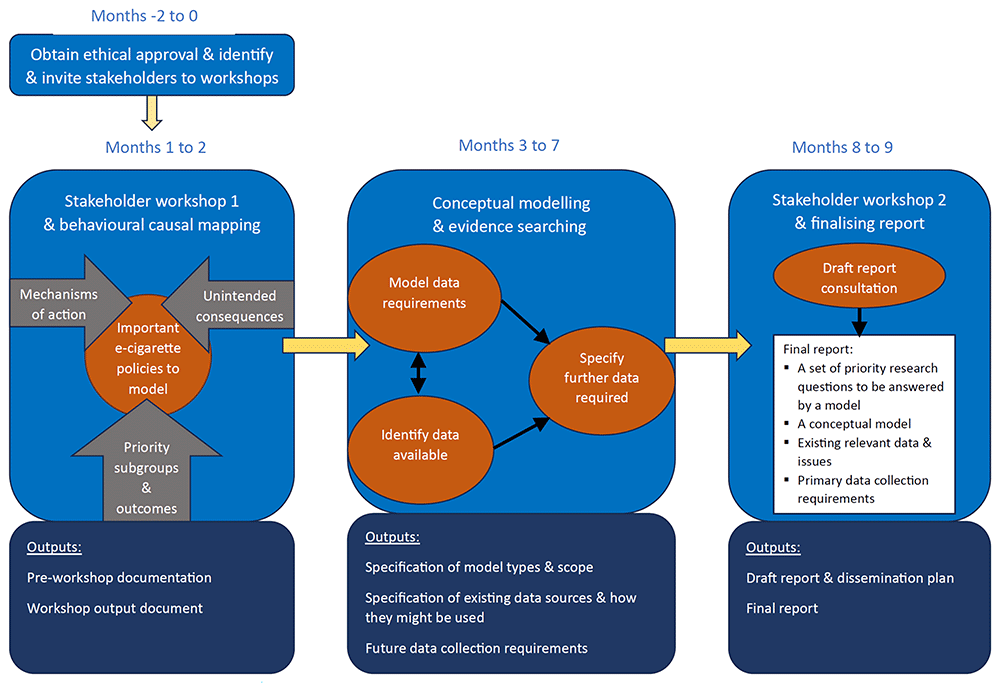 Within the workshops we developed our understanding of the problem to be modelled by identifying stakeholders’ views of the key vaping behaviours that policy could affect, and which other behaviours interact with these vaping behaviours. We also voted on the priority policy themes, subgroups and outcomes of importance for modelling (See Section 3). We developed causal behavioural maps for each of the three priority policy themes, with each policy theme being considered by two groups within the workshop, leading to six initial maps. Within each theme the two maps were subsequently amalgamated into one map for each policy theme and verified within a project team meeting (see Section 4). We determined essential model requirements and desirable model requirements based on these workshop outputs. We used the outcomes of the workshop, the evidence identified from the reviews and the datasets and a modelling decision framework (the PHEM-B toolbox)19 to provide recommendations for the types of modelling that could be constructed.