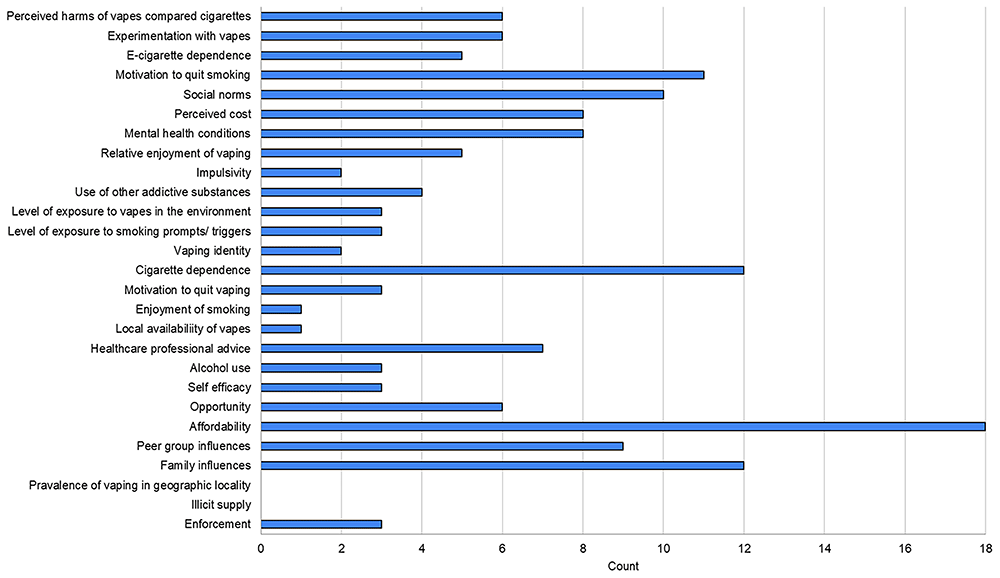 Within the workshop, groups identified which vaping behaviours (i.e., vaping initiation, regular vaping, vaping quit, vaping quit maintenance) are important for their assigned policy theme, which other behaviours interact substantially with these vaping behaviours, and what evidence exists about their interactions.