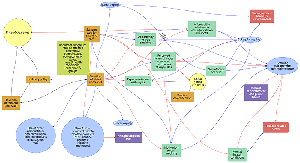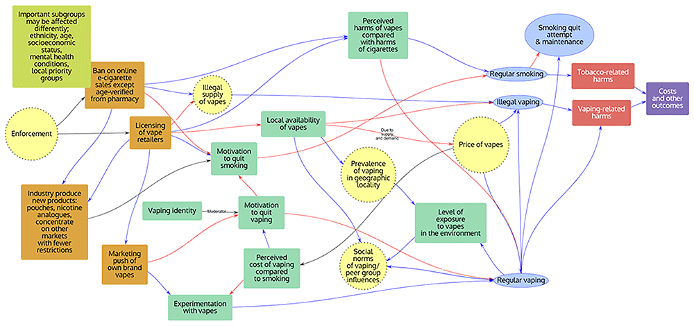 To understand what is relevant to the problem of making decisions about vape policy, we developed systems maps of the problem, based on stakeholders’ advice. These provided a basis to prioritise variables to model, model type and systematic reviews of the empirical evidence.