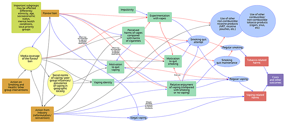 For specific inputs, the key lack of useful data concerns the absolute harms of vaping in people who have never smoked (and transitions from vaping to smoking), which requires de novo data collection. In addition, mechanisms of actions likely vary across policies and will therefore require specific analysis (e.g., for place-based interventions spatial analysis could be incorporated within agent-based models). Due to the frequent and impactful ways industry has circumvented vape regulations—such as through new products that may mitigate restrictions on flavours (e.g., through accessories) or nicotine content (e.g., through increasing bioavailability) —policy models should incorporate or at least acknowledge potential industry responses. They should also capture unregulated vape use as this may carry greater risk than regulated vape use, in particular for vapes containing illicit/banned substances (and increase in response to policy changes) as well as interactions with other nicotine products. Environmental and retail outcomes were considered outside the scope of this project, but we recommend that an individual-level health economic model be developed for a UK population to estimate long-term impact of vape options incorporating those outcomes as well as health outcomes across appropriate age ranges and important subgroups.