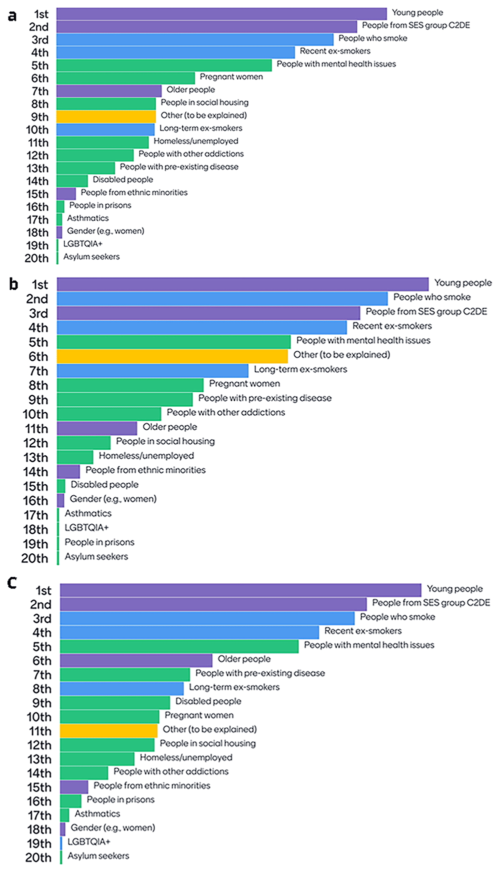 b) What are the relative impacts of priority policies on these transitions? (With a particular focus on the variation in the impact of policy between: (i) young people, (ii) people from different SES groups, (iii) people with mental health issues, (iv) people who smoke and (v) people who have quit smoking)
