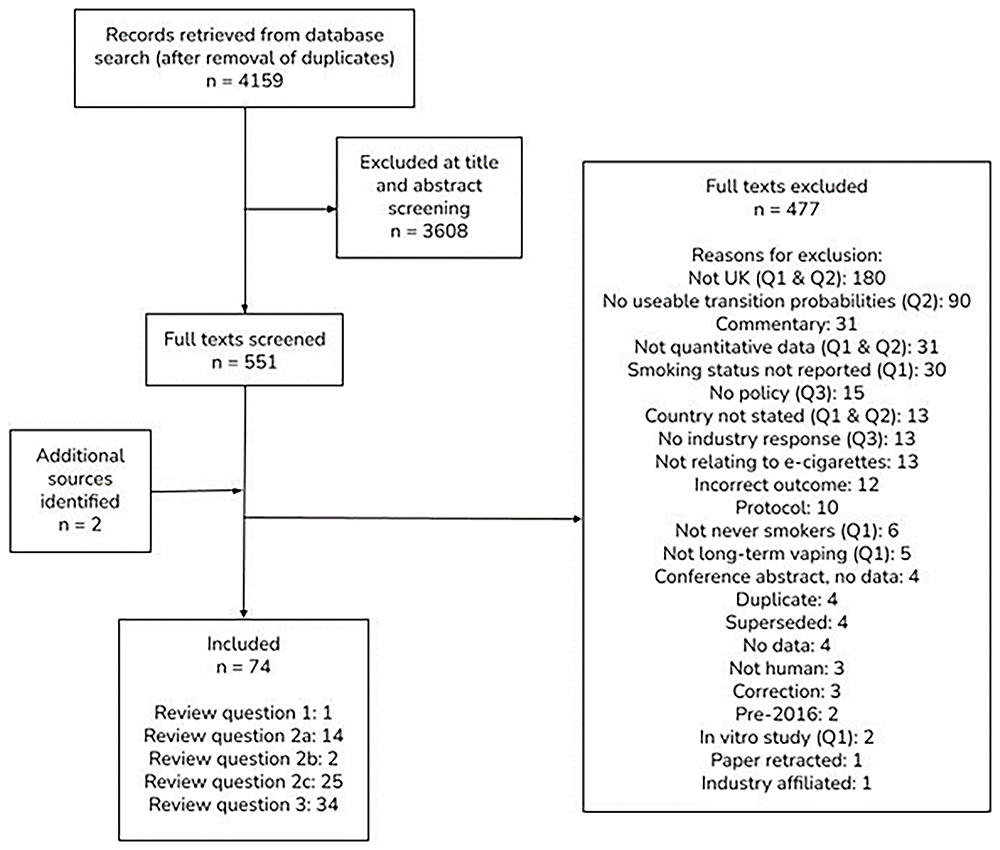 Review questions 1 and 2 were limited to the UK because health and transition implications may be reliant on the UK’s particular population profile, social norms about smoking and vaping, and the legal framework and the characteristics (e.g., ingredients) of the products available on the UK market (e.g., implementation of the revised Tobacco Products Directive into law in 2016 placed restrictions on some products).