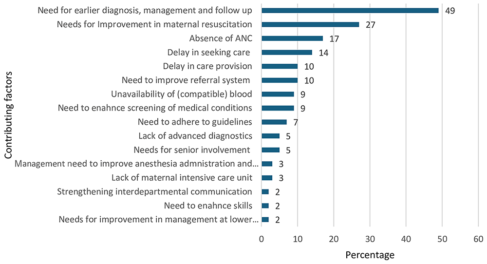 As indicated in detail in Figure 2 below, the CEMD committee identified a total of 102 individual factors, grouped into 16 categories, that contributed to the 59 maternal deaths we included in this report. These factors were mainly related to diagnosis, management or follow up at the facility level 29/59 (49%), maternal resuscitation and stabilization 16/59 (27%), and absence of antenatal care 10/59 (17%).