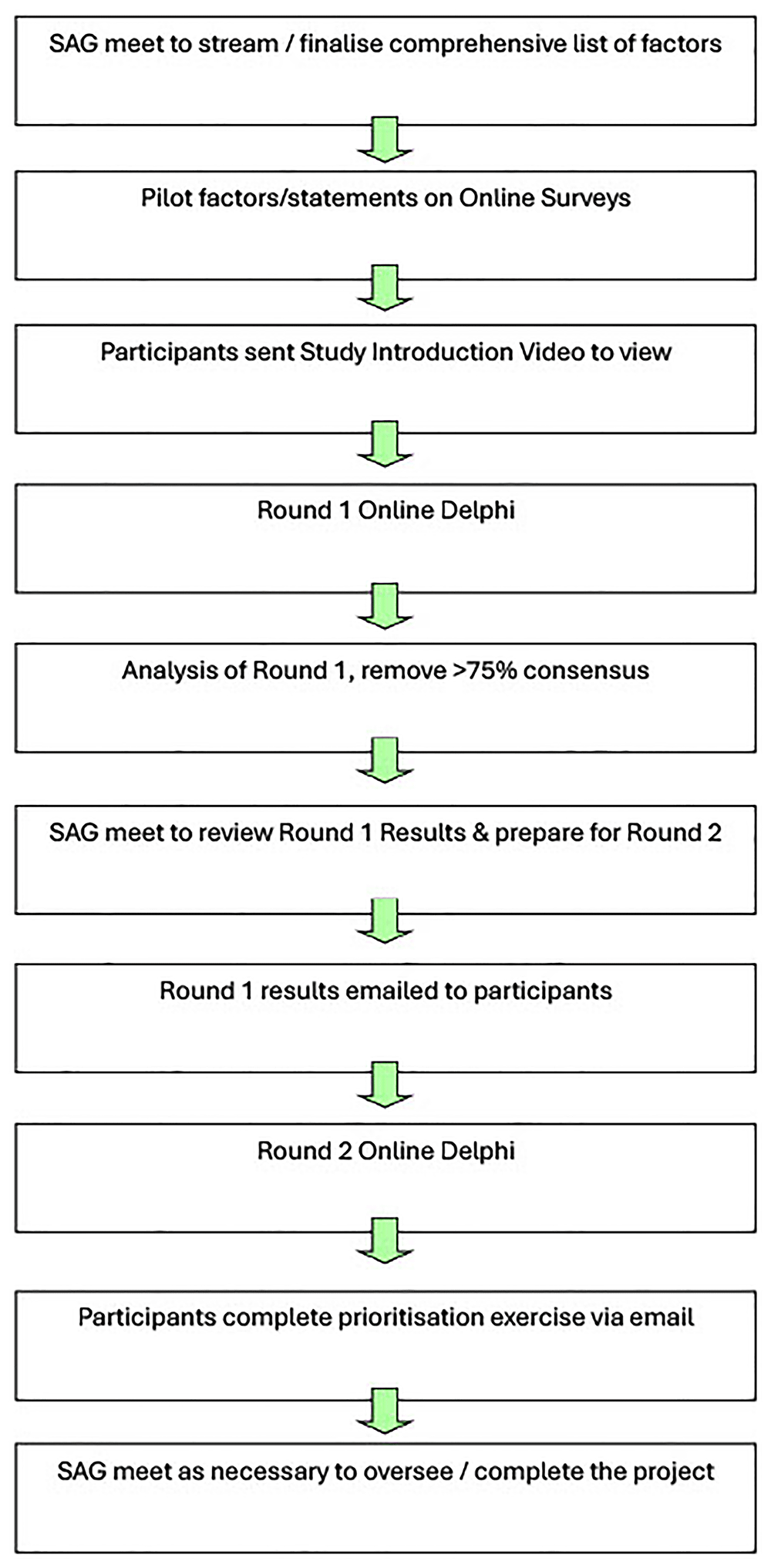 All participants will be asked to view a short (10–15 mins) recorded introduction video made by the lead author. The video will introduce all previous related work to date and explain what is expected from participants during the online modified Delphi rounds and prioritisation ratings undertaken via email.