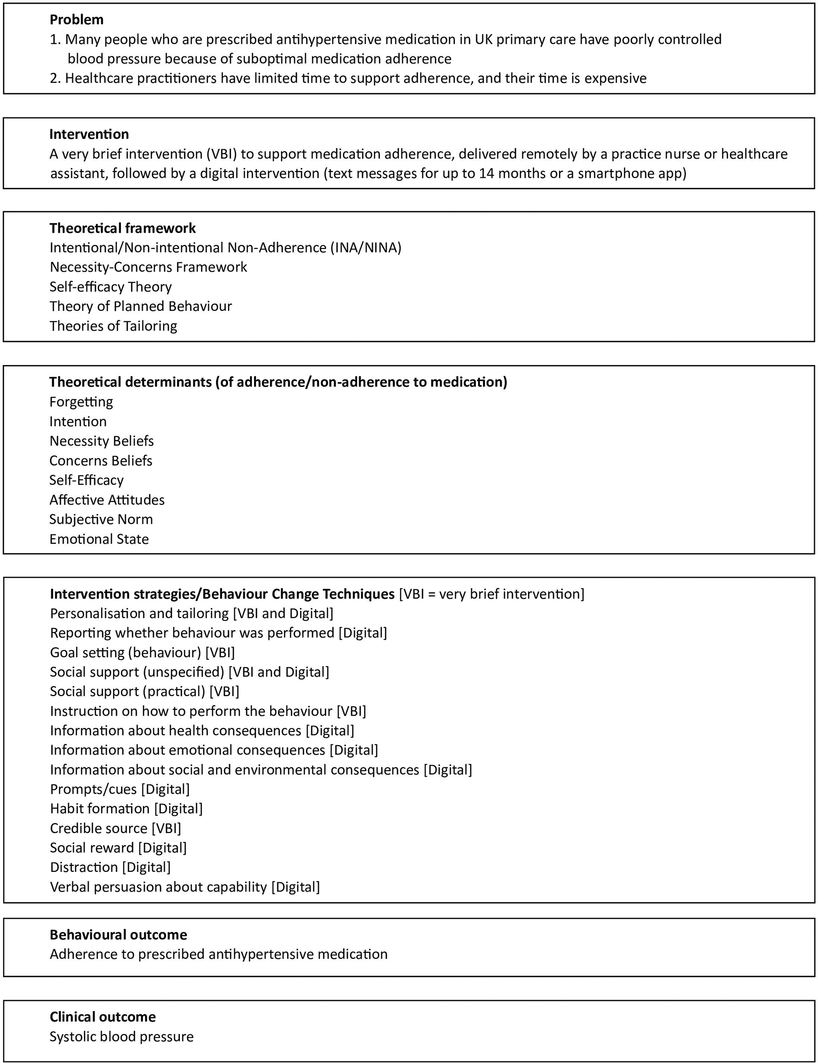 The PAM intervention is a theory-based intervention based on the distinction between intentional and non-intentional non-adherence (INA and NINA),28–31 the necessity-concerns framework,32 self-efficacy theory,33 the theory of planned behaviour34 and theories of tailoring.35 The intervention uses relevant behaviour change techniques (BCTs36) and was informed by our experience of designing and evaluating brief face-to-face and digital interventions for behaviour change, including medication adherence37–44 and by extensive reviewing and development work.45–48 It comprises two components: a VBI delivered by the practitioner remotely using a telephone or video call, lasting no more than five minutes, followed by a digital intervention. (See Figure 2 for the logic model.)