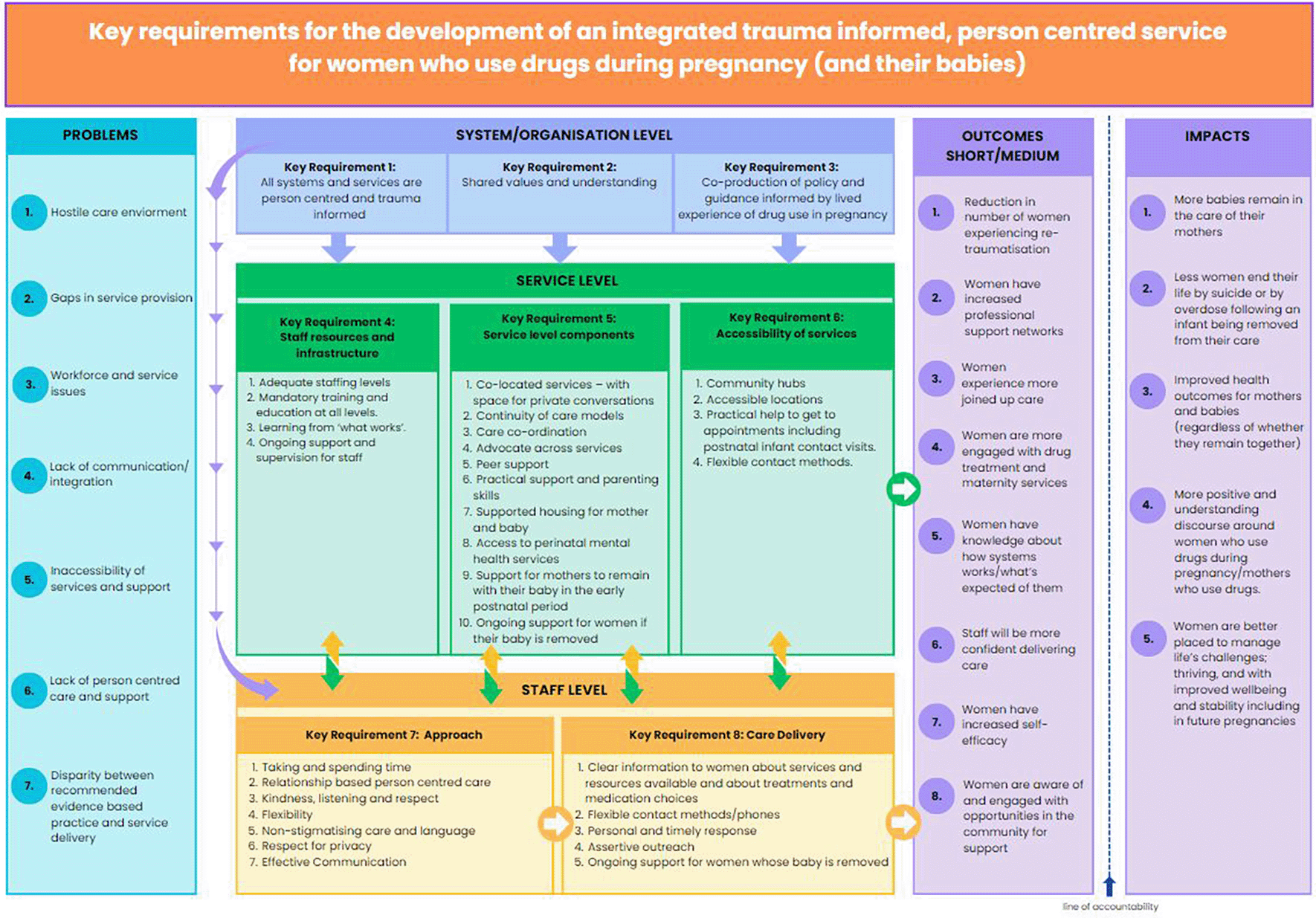 Using the Theory of Change we found that adding services in one area may not be effective if the whole system of care is not considered. Most of the recommendations are directed at organisational/strategic and service level with fewer recommendations at individual staff level. This is in recognition that staff are only able to provide optimum care when service infrastructure, resources, training, and shared values enable them to do so. Consideration of a whole service approach is necessary to deliver safe, person centred services to women who use or are in treatment for drug use and their infants.
