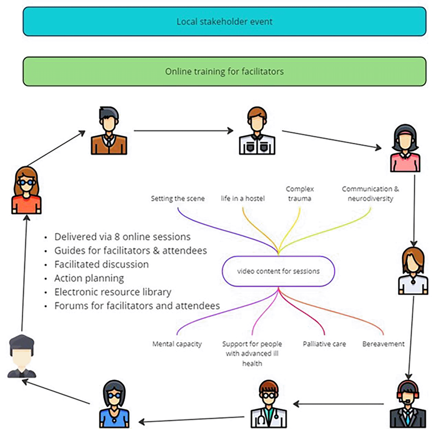 The original vision specified that the 8 sessions should be delivered over 8 separate occasions, probably monthly, most likely online. The idea was that the Communities of Practice would then continue to meet after the completion of the 8 sessions.