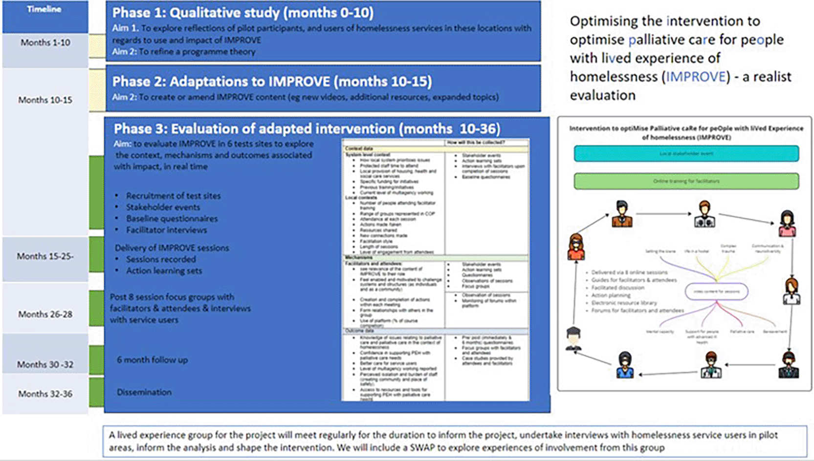 We will work with both our steering group and our lived experience group to develop IMPROVE and we will present revised ideas back to them and other interested and relevant partners. We will use our professional connections, and the National Palliative Care and Homelessness Network (which the authors developed through a previous NIHR grant)15 to identify experts who could be involved in developing additional material.