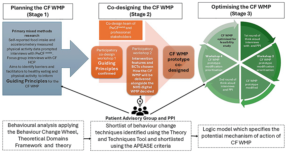 Mixed-methods research with PwCFow/ob and CF health care professionals will identify the barriers and facilitators to healthy eating and physical activity experienced by PwCFow/ob. This will inform the guiding principles to underpin the co-design of the CF WMP and how it will address the dietary and physical activity behavioural needs of PwCFow/ob to ensure it is engaging, acceptable and motivating. Co-design: a series of participatory workshops with PwCFow/ob and key stakeholders will use guiding principles to specify design objectives and corresponding intervention features. Optimising: think aloud interviews with PwCFow/ob will gather feedback on the CF WMP, to iteratively refine the programme.